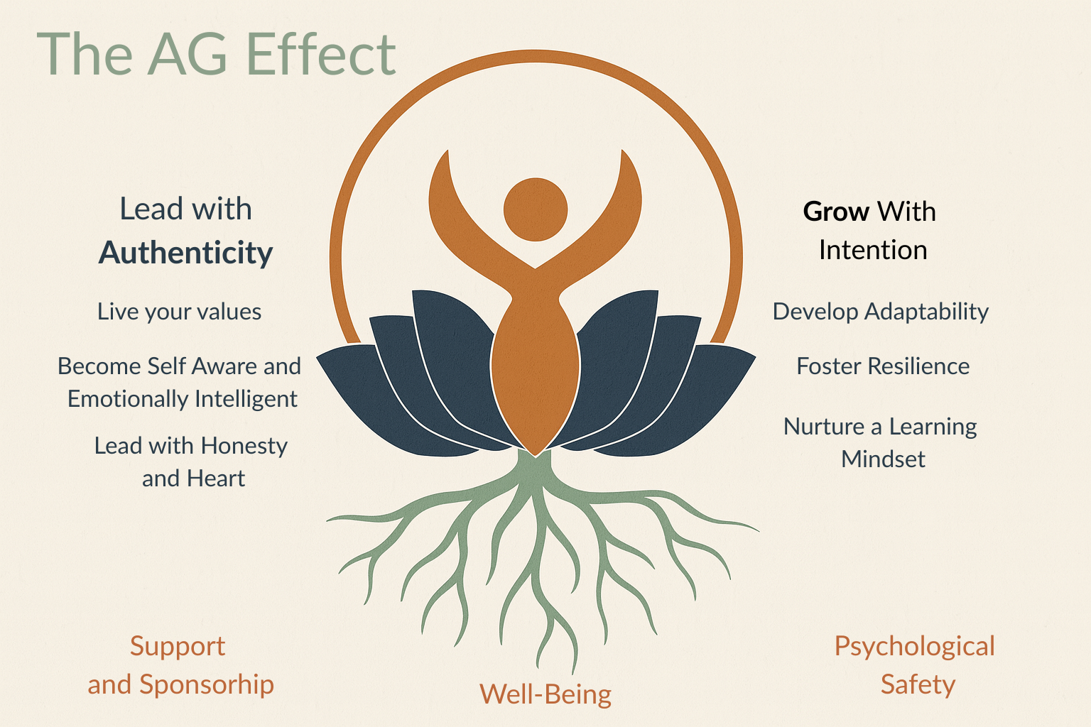 At The AG Effect, psychological safety lives in the roots of my leadership model — alongside well-being and support — because without it, authenticity and growth can’t take hold.